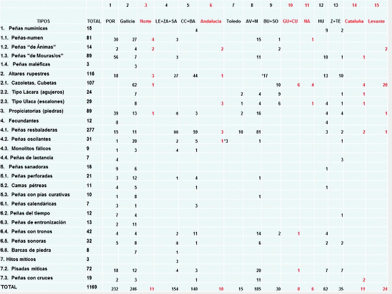 Sin embargo, todavía falta localizar y estudiar las peñas sacras de toda la región cantábrica hasta el País Vasco, de Navarra, de las áreas sedimentarias de la Meseta Norte, de Palencia, Valladolid y Segovia, de la zona oriental de la Meseta, desde Soria y Guadalajara a Cuenca y Albacete, de Cataluña, del Levante y de Andalucía, aunque sobre varios de estos territorios se aportan importantes informaciones en este Coloquio. Pero hay que señalar igualmente que las prospecciones en Portugal se han interrumpido en la práctica, a pesar de la importante tradición de estudios desde el siglo xix y de las aportaciones de Maria João Correia Santos sobre los altares, de Martín Almagro-Gorbea sobre las peñas propiciatorias y de las novedades aportadas por José Miguel Sánchez Benito en la zona de Trás-os-Montes.