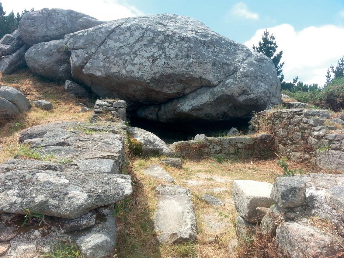 Contexto arqueológico (yacimientos próximos, vías antiguas, etc.): Luis Monteagudo localizó varias mámoas destruidas de gran tamaño al sur de la cuota 527 y otras menores al sureste de la cuota 513, que se sitúan próximas al camino procedente del Castro de Elviña, A Coruña, que se dirige hacia el sur por Orro, Bregua y Ledoño hasta el Monte Xalo y Gustovedro. También en el entorno del monte hay castros, como el de Coto de Guichar, el castro de Vinseira pequena y el castro de Paleo.