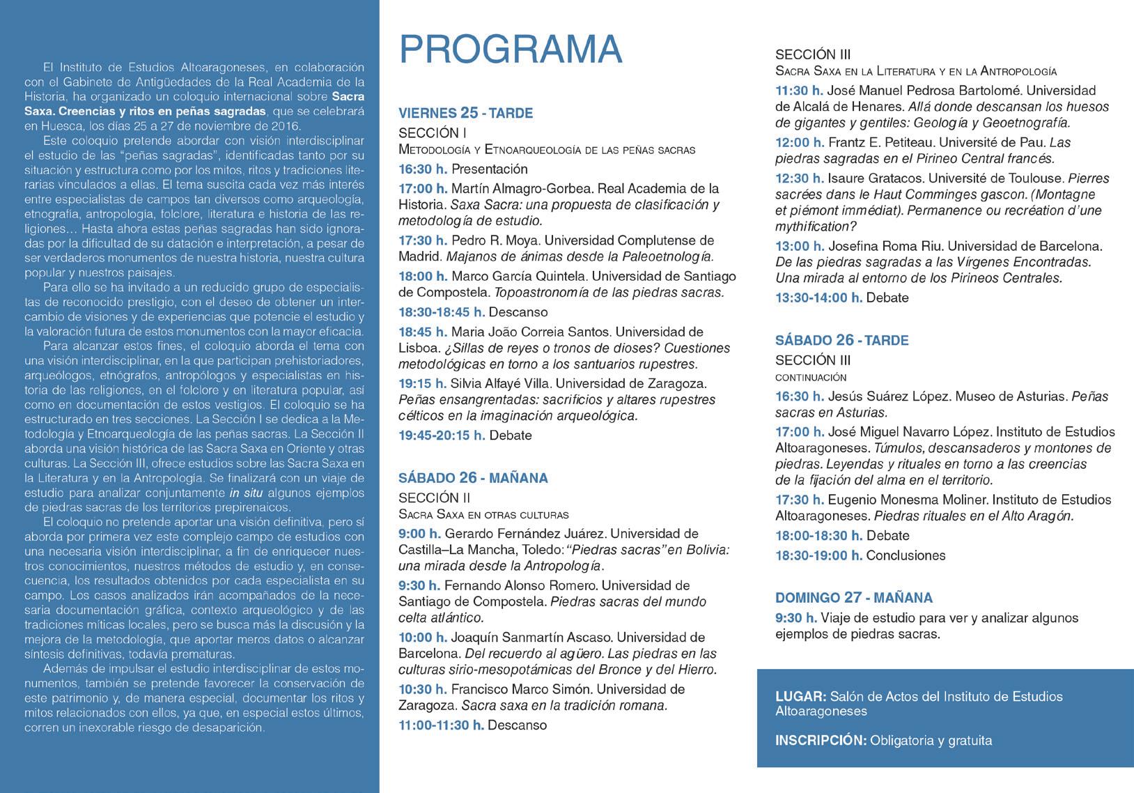 Transcurridos tres años desde que en 2016 el Instituto de Estudios Altoaragoneses de la Diputación Provincial de Huesca convocó el I Coloquio Internacional sobre Sacra Saxa: creencias y ritos en piedras sagradas (fig. 1), se celebra en Huesca, del 21 al 23 de noviembre de 2019, el II Coloquio Internacional sobre Sacra Saxa: las piedras sagradas de la península ibérica, de nuevo bajo la hospitalidad del IEA y con la colaboración del Gabinete de Antigüedades de la Real Academia de la Historia y la Fundación Ibercaja.