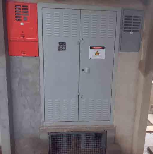 Novo quadro de entrada de energia do prédio, agora com separação para a ligação de bomba de incêndio (quadro vermelho), que antes ficava em um único painel (ver detalhe)