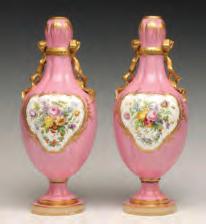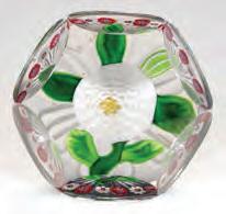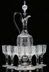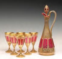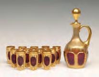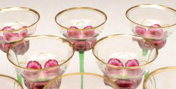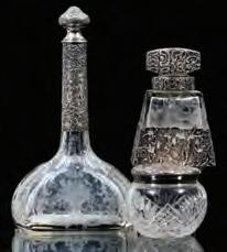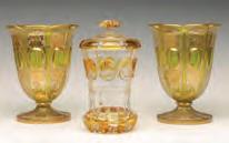1. A pair of overlaid and scent bottles with hand painted floral enamels fired on.2. A pair of handled mugs with cut and polished panel sides and hand painted floral enamels fired on.3. An emerald green bottle with white overlay cut back to green.