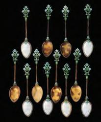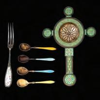 The sterling silver tea strainer enameled in traditional Celtic designs with stamped mark of 925S and TOSTRUP for Jacob Tostrup (Norway 1806-1890) is accompanied by four enameled spoons stamped 830s.A nonScandinavia sterling fork with enameling is included. Sizes range from 2.5 to 5.75 inches.