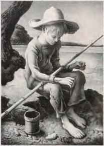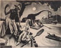 The lithograph from an edition of only 100 prints published by Associated American Artists is signed by the artist in pencil below the image lower right and titled verso by the original AAA publisher's label, listed as Fath catalog number 12. A good strong impression on Rives paper with full watermarks as shown here.Benton's comments in Fath read: 'Every two or three years I reread Mark Twain's great saga from start to finish, finding it as fresh as when I first read it. With the spirits of Huck and Jim pushing me, I have been up and down the Mississippi many times. Though I travelled on big boats rather than intimately by raft, I like to believe I've caught glimpses of them. It's certain they're still there behind some island or up some creek.'