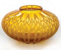 The tall, heavy, flawless amber glass candlesticks are cut and polished on every surface from the rayed foot (each cut differently) to stepped base, cut panel stem, faceted knop, paneled candle cups topped by finely crosshatched turrets.