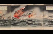 The Japanese color woodblock hexaptych. a long battle scene printed on six separate pages joined to create a single scene, is signed Kokunimasa with artist's flower seal.This print celebrates the Great Victory of the Imperial Navy in the Russo-Japanese Naval Battle at Port Arthur - Hurrah! The event saw a Japanese torpedo boat destroyer attack Russian ships at Port Arthur decimating the Russian fleet at the beginning of the RussoJapanese War.