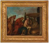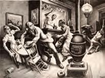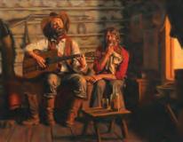 Signed and dated lower right front, the work is inscribed ...' This is a self portrait of Byerley, John (?) bought it from Byerley' in pencil on the reverse.The scene inside a cabin with light coming from a window to the left of the two figures, one singing and the other crying for one reason or another, appears slightly lighter here than in person. The work displays Byerley's skill for depth and light in a composition. The inscription identifies this as a self-portrait. It's unclear which of the two might be Bob.