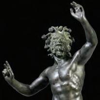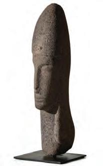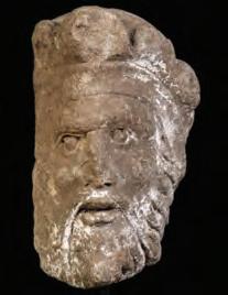 The lichen encrusted carving of Neptune or Zeus of unknown origin and age, possibly a fragment from a large garden sculpture or architectural element, is displayed on a custom iron stand.