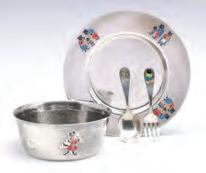 The slightly tarnished child's feeding dish on underplate with similar fork and spoon are enameled with characters from traditional English fairy tales and nursery rhymes. The fork and spoon are made by Whiting while the bowl and underplate are stamped for Barbour Silver Co. Plate measures 6.5, bowl is 1.75 x 4.625 inches, total weight 12.05 ozt.