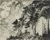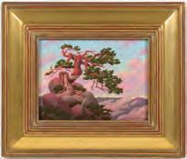 The study of a windswept evergreen and rose tinted clouds above purple mountains at sunset is signed lower left front and displayed in a fine custom frame.The life story of artist Emerson Everett Glass is fascinating, and poignant. His biography on AskArt.com describes a life of hardship. For some reason, Emerson never sold a painting during his lifetime. He was largely self-taught, except for some informal instruction from his friend and mentor Birger Sandzen.