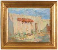 Norman Stiles Chamberlain was born in Michigan. He studied art there and in Europe before settling in Californai in the 1930s where he was employed by the WPA.This composition of a California mission courtyard fountain near purple mountains is displayed in its fine, original carved and gilded American Impressionist style frame, and signed lower right front.