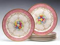 Each plate in the set has an applied, gadrooned border, engraved crest with motto of Dum Varion, the characteristic rolled edge of Old Sheffield Plate, and a seemingly modern back stamp of ENGLAND. Measures 10 inches.