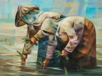 The impressionist composition depicting women in Tibetan garb is signed lower right front.Qianghai Province encompasses a high Tibetan plateau, home to Buddhist monasteries known for their Thngaka paintings.The Chinese American artist Liu, Huihan is most associated with San Francisco, California..