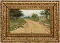 Clarence Hinkle was born and raised in California and studied art there as well as in the east with American impressionists John Twachtman and William Merritt Chase before receiving a a Cresson Traveling Scholarship that took him to France before 1913.This view of ships at low tide in Etaples, France is displayed in its fine, original carved and gilded American Impressionist frame, the artist's signature is lower right front as well as on the reverse where various interesting tags and written notations are found.
