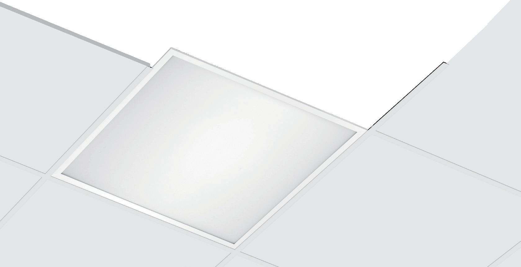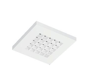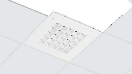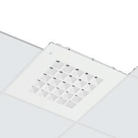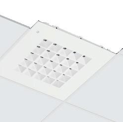 Housing-reflector: in V2 shatterproof, self-extinguishing polycarbonate, coated with high-performance aluminium powder and equipped with anti-reflection and anti-glare optics. Perimeter border on the false ceiling has white or aluminium coloured photogravure finishing. Support bracket in galvanised steel with housings for fastening springs made in galvanised steel wire for false ceiling mounting. Shielding at 65°.