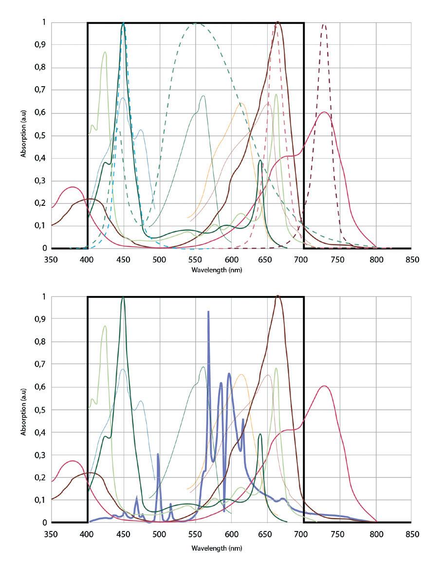 • Diverse lunghezze d’onda che compongono la luce, contribuiscono alle varie fasi del processo della fotosintesi.