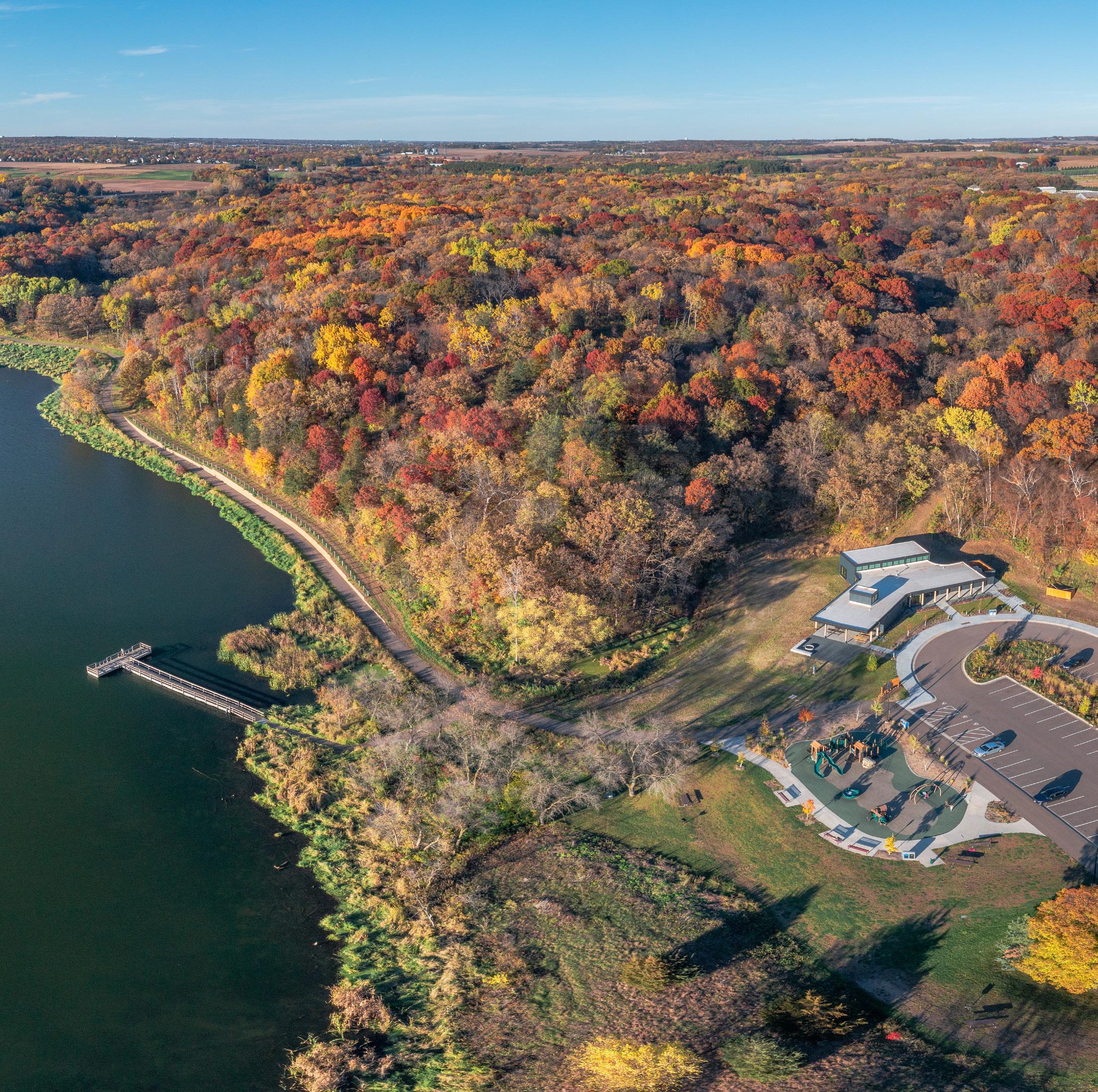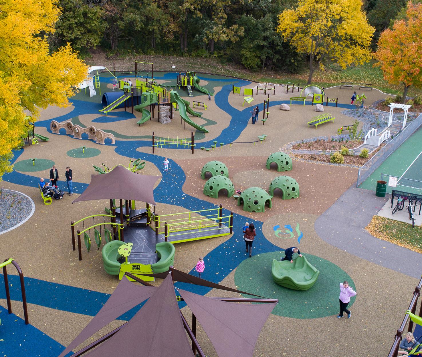 Our signature destination is Cottage Grove Ravine Regional Park. This beautiful Washington County park offers wooded hills, a scenic lake, and miles of trails for hiking, biking, cross-country skiing, and fishing. It’s your go-to for experiencing Minnesota’s natural beauty year-round. For families, Woodridge Park is a must-visit. It is home to one of the largest and most unique play areas in the region: the Inclusive