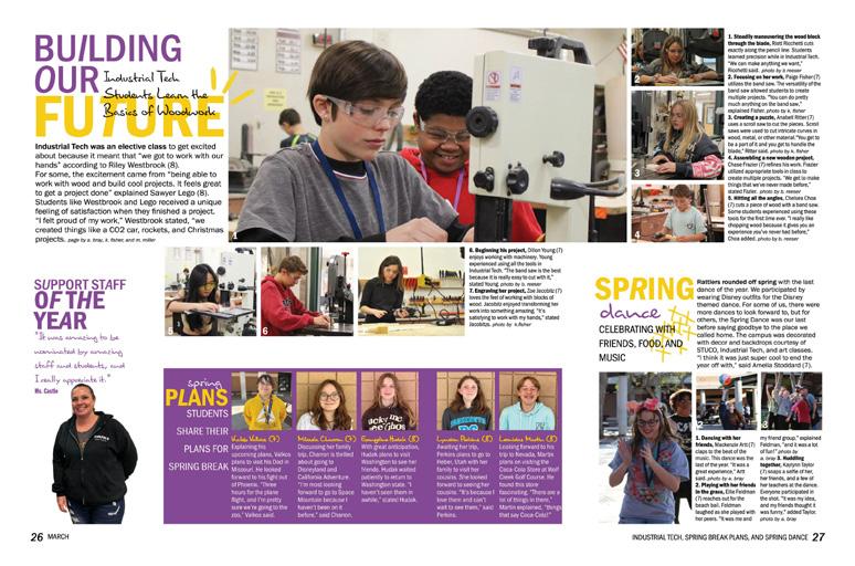 Captions take center stage in this yearbook — both with their reader service in the caption lead-in style and by hitting the perfect ABCDQ formula. And, Ingenium staffers made sure that the captions for cover photos were placed on the endsheet. Bonus points for remembering that all photos are worthy of identification. Finally, another essential part of the lineup, bylines were included and formatted correctly. Go team.