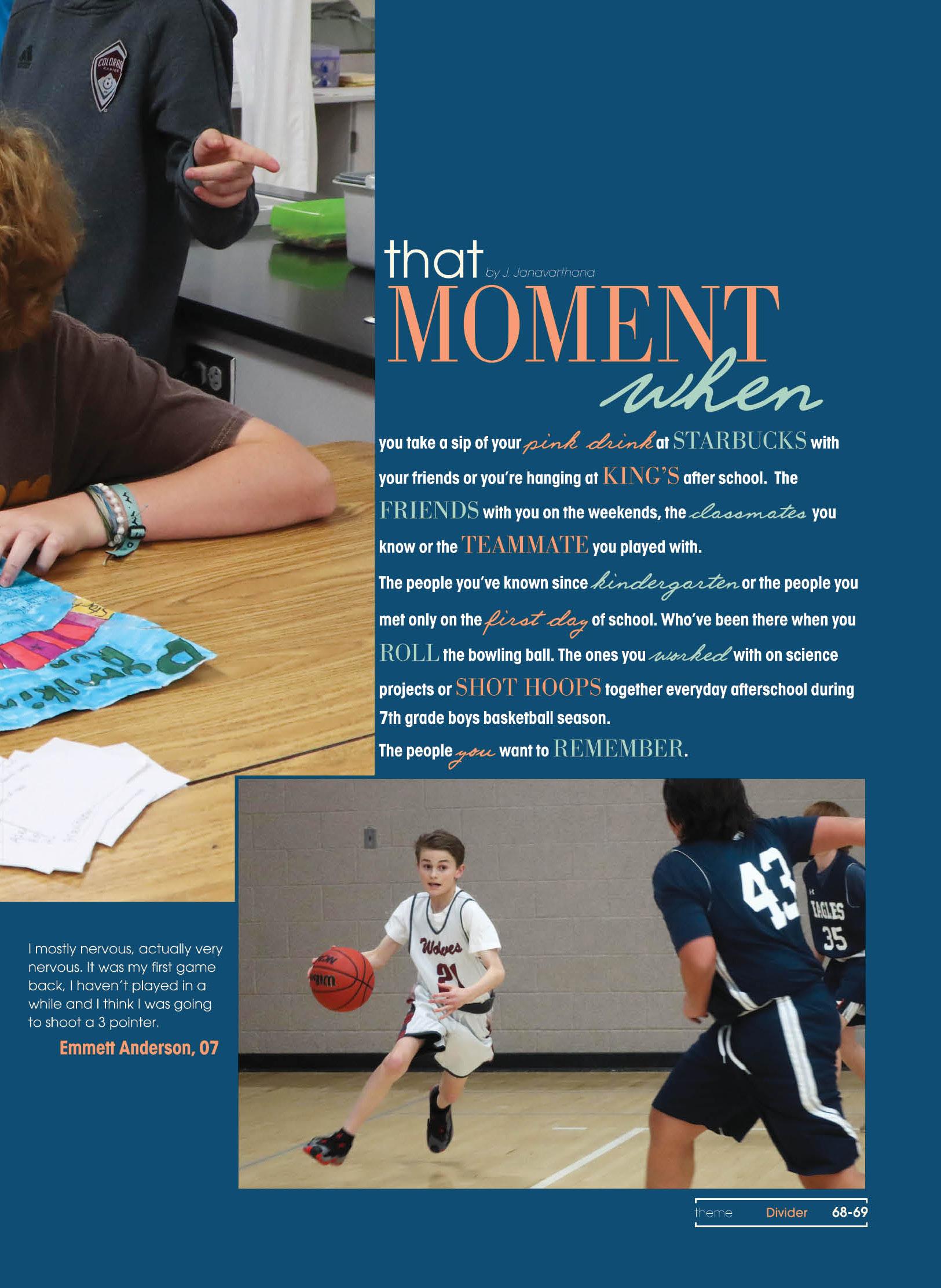 Include a visual/verbal connection between the theme and the section titles, especially if they are renamed to match the theme. Corona Del Mar MS took theme visuals and verbals and ran with them. Notice how water-themed section titles lend to the theme “Smooth Sailing” on the cover with the stripes coming to play on the endsheets.