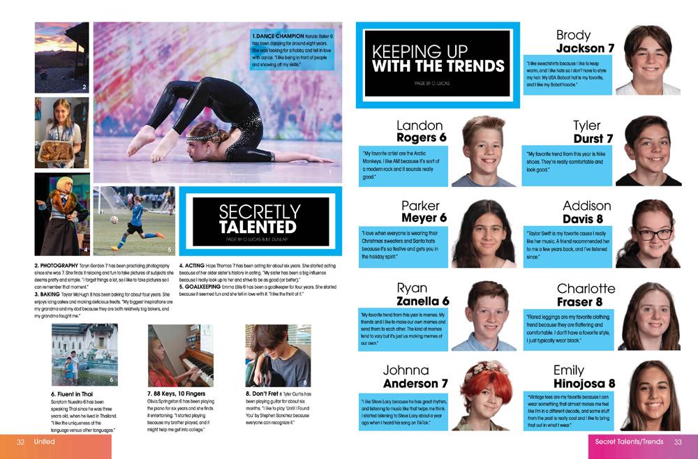 PARTY IN THE BACK: A good yearbook has a good reference section. Here’s an example to check out. The staff opted for more than just talking heads. Quick quotes are still in the mix, but the addition of cutouts, graphics and snippets of club information elevates the coverage to a whole new level. It’s always a bonus to see coverage between the portrait panels — rather than just the sides or top and bottom.