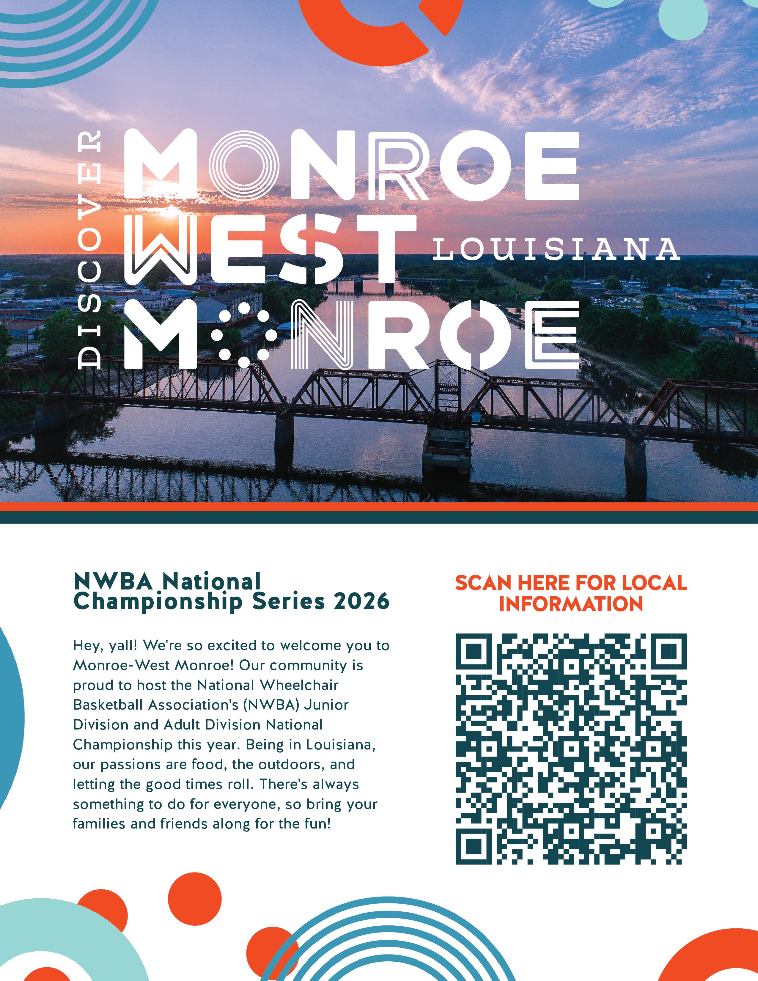 The NWBA Board of Directors and National O ce hope you enjoy the competition, the special events, and the hospitality of the greater West Monroe community. We remain committed to growing the game of wheelchair basketball through partnership, inclusion, and opportunity—both on and o the court.