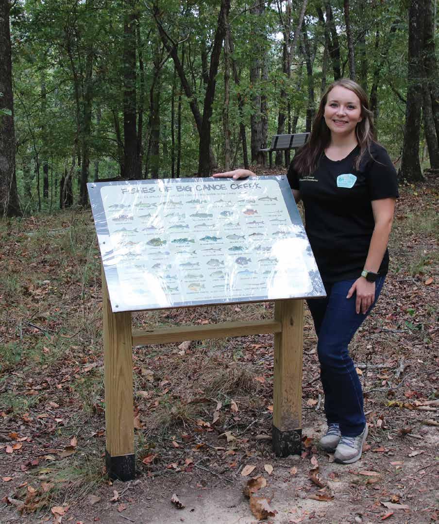 Education Coordinator Lucy Cleaver shows off a fish species sign at Big Canoe Creek Preserve. Photo by