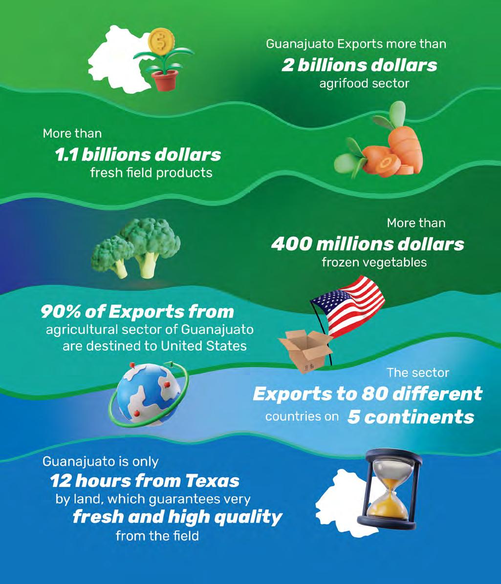 The central location that the state of Guanajuato has is strategic for its economic development, since it makes it an articulating point, railway and all kinds of economic activities, and in particular for the agri-food industry it is fundamental, which has allowed it to be placed as the second exporting cluster of the state.
