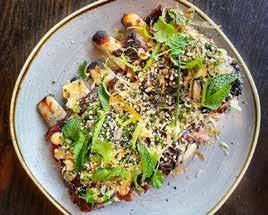 SWEET POTATO BISCUIT AND SAGE DUROC SAUSAGE GRAVY: HOUSE-MADE BISCUIT, ROASTED PORK LOIN, SAUSAGE GRAVY, FRIED SAGE LEAVES STICKY PIG WINGS: HONEY MISO GLAZED RIBLETS, WASABI PEANUTS, FURIKAKE, CHILE THREADS, BIRD’S EYE CHILE OIL, COMPRESSED SAMBAL CHILE CUCUMBER PICKLES, KIMCHI RANCH DRESSING