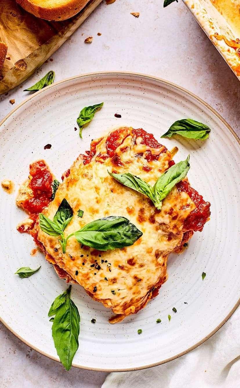 Turn the oven to broil Broil for 1 to 2 minutes, or until the cheese is lightly browned on top Remove from the oven and let cool for 10 minutes. Garnish with fresh basil and crushed red pepper flakes, if using Cut into squares and serve warm