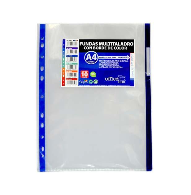 Pack de 10 fundas multitaladro, fabricado en plástico resistente con acabado ultra cristal y lomo de color ancho extra. Colores surtidos.
