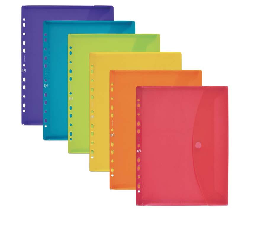 Sobre de polipropileno translúcido con cierre de velcro. Puede almacenar una medida de 25 hojas. Dispone de multitaladro en un lateral. Colores surtidos.