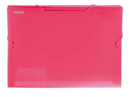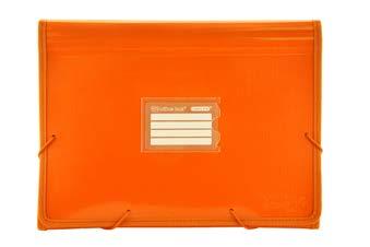 Carpeta de plástico con refuerzo de tela en los bordes, formato para hojas A4, cierre de goma elástico y fuelle grande para aumentar la capacidad de almacenaje. Medidas: 25 x 34 cm.