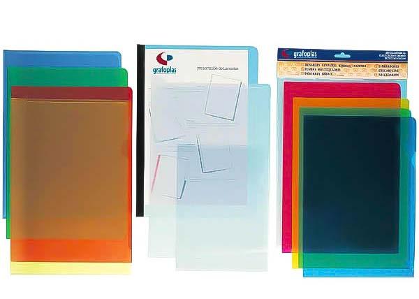 Carpeta de plástico con tapa flexible y con fundas transparentes soldadas al lomo. Tamaño folio.