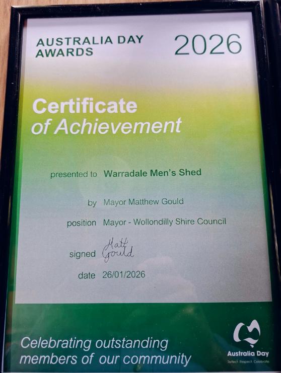Warradale Men’s Shed has been named winner of the Local Hero Community Group category at the 2026 Wollondilly Australia Day Awards, recognising the outstanding success of its Intergenerational Program.