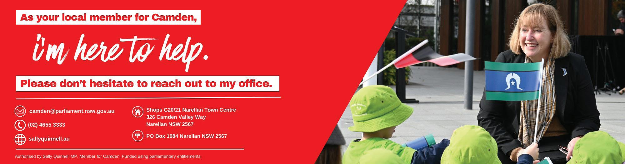 If you have any other state or local issues you need my assistance on, please don’t hesitate to give my office a call on (02) 4655 3333, or send me an email at camden@ parliament.nsw.gov.au. I’m always here to help.