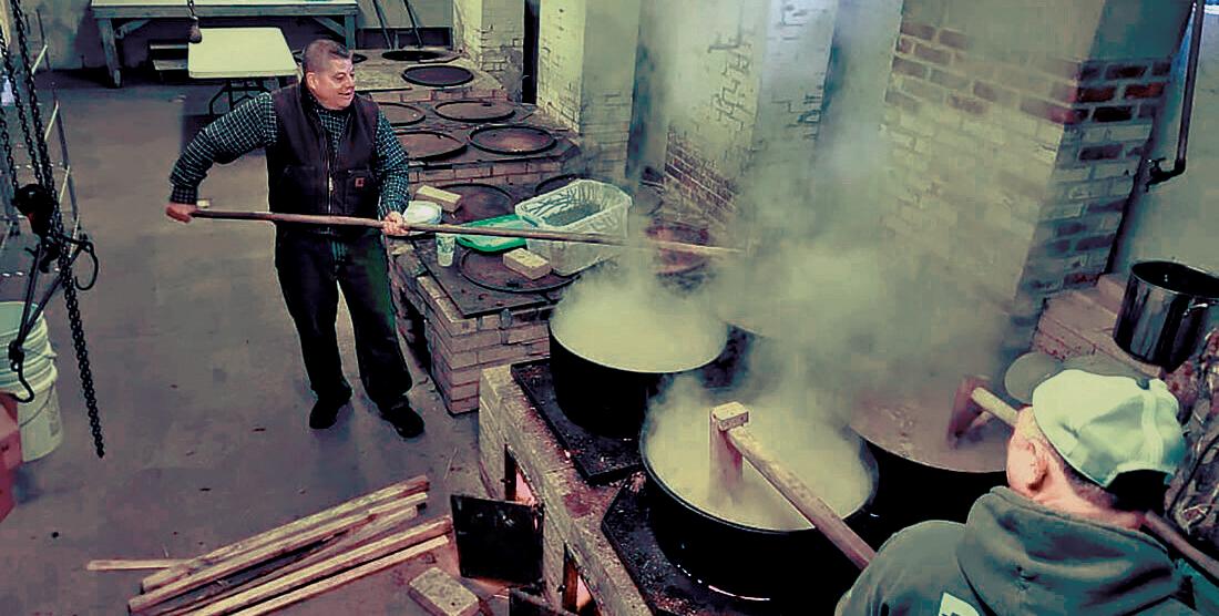 Sixteen 20-gallon kettles warmed by a wood-fueled battery of furnaces contain the soup, which is stirred using long wooden paddles during shifts lasting two hours and 20 minutes, the time required to soften the dried navy beans that are cooked in a simple recipe along with beef, salt, and spring water.