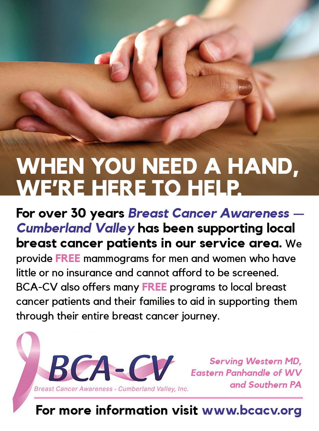 7 p.m., Breast Cancer Awareness Cumberland Valley, 12916 Conamar Dr., Suite 201, Hagerstown Call 301.791.5843 or visit www.bcacv.org.