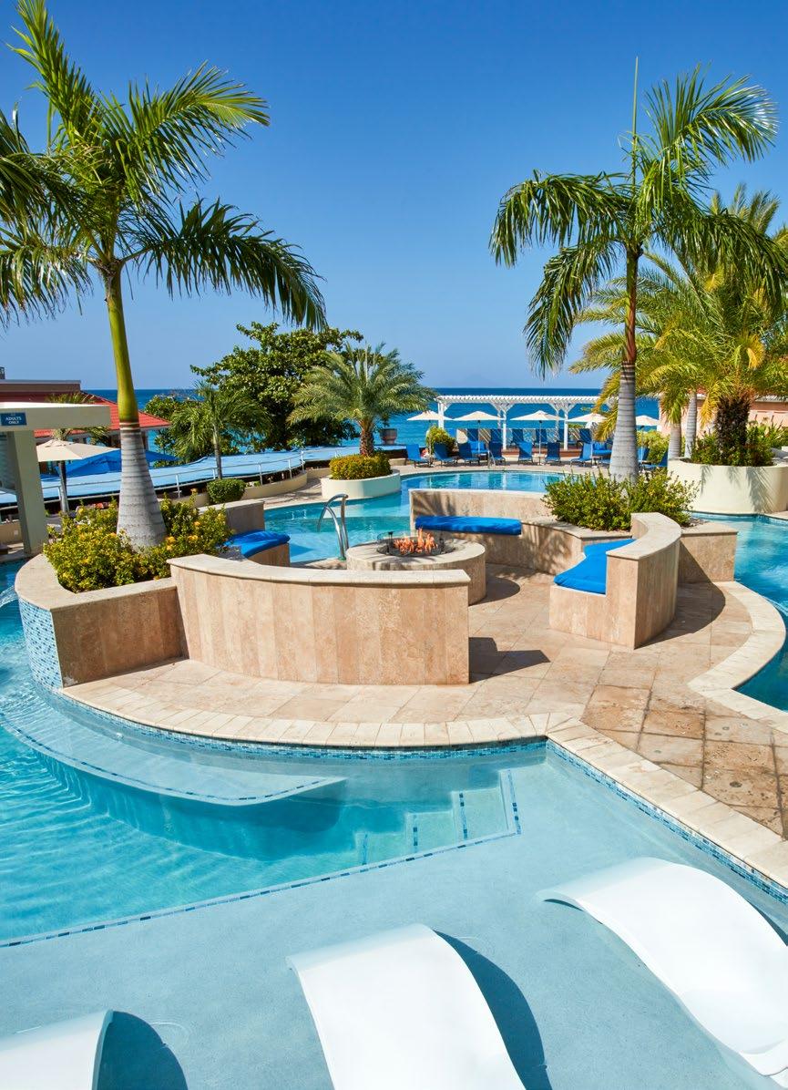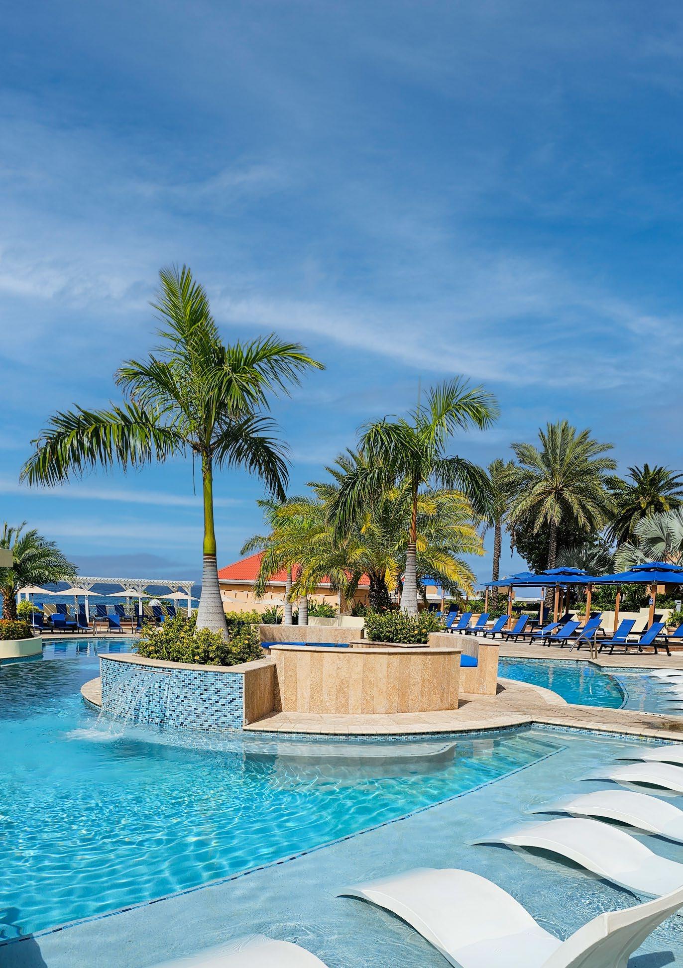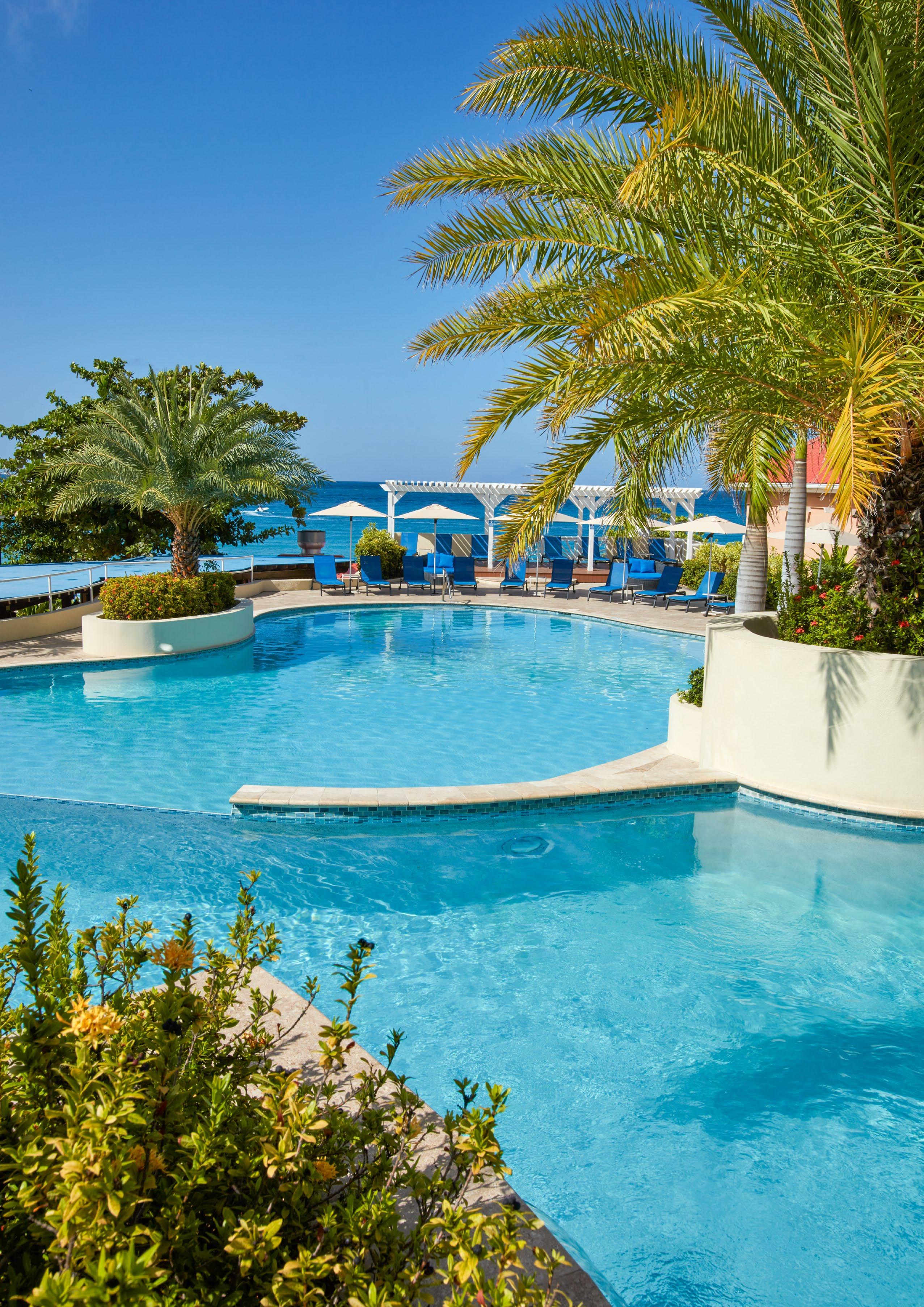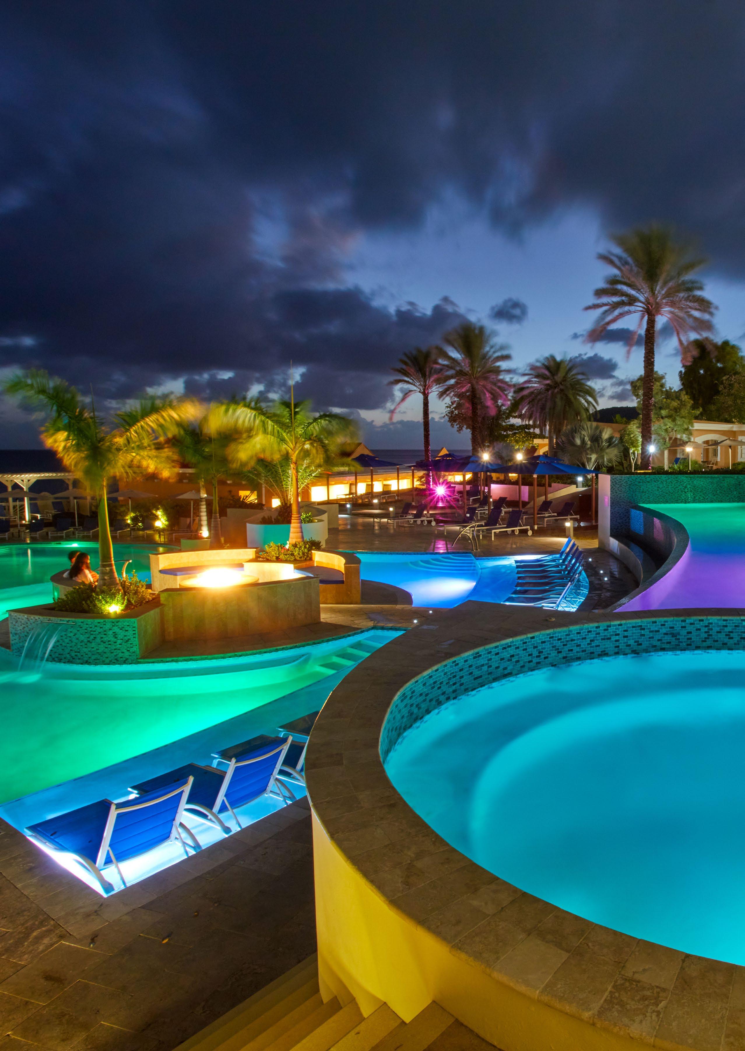 Cool off by one of three spectacular ocean view pools. Our main pool features multiple swimming areas that spill into one another, soothing waterfalls, a central fire pit, a lively swim-up bar, an oversized hot tub, comfortable cabanas, and seating on several terraces.