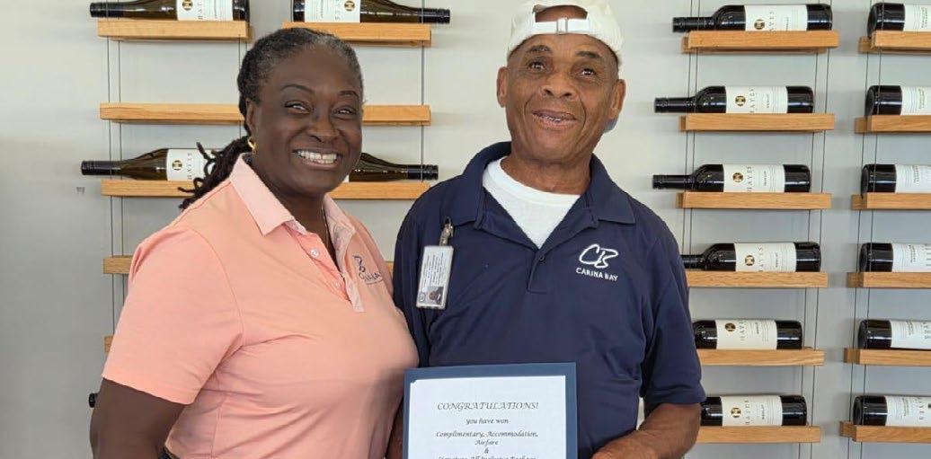 Cusa Christian, Carina Bay GM, smiles proudly alongside the resort’s employee of the month.