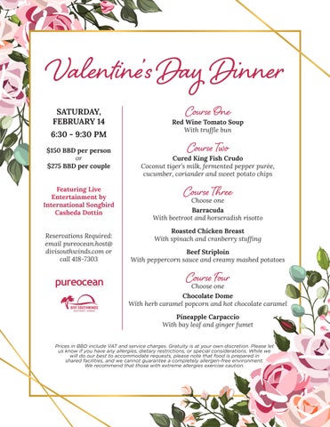 Reservations Required: email pureocean.host@ divisouthwinds.com or call 418-7303