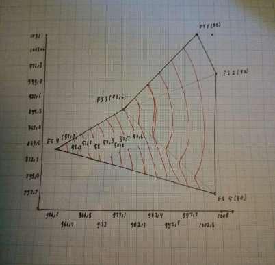 8 Selanjutnya garis bantu yang sudah dibuat diukur, agar didapatkan nilai elevasi dari 2 titik yang memiliki nilai elevasi yang berbeda. (Misalnya pada Titik Fs 2 dengan elevasi 50 dan Fs 3 dengan elevasi 50,6. Terdapat selisih elevasi 0,6, dan jarak sebenarnya antar 2 titik tersebut pada peta yaitu 6,3 cm. Selanjutnya untuk menentukan setiap titik diperlukan pembagian nilai dari jarak antar 2 titik dengan selisih elevasinya, yaitu 6,3 : 6 = 1,05. Dari hasil tersebut, disimpulkan bahwa dalam garis bantu tersebut, setiap 1,05 cm terdapat sebuah titik dengan elevasi yang berbeda-beda).