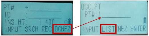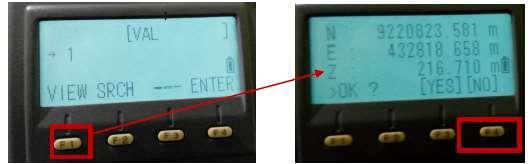 Makapilihlah“LIST”dengantekan tombol F2,setelahitudicarikoordinatyangdidapat dari tempat berdirinya alat sebelumnya (titik BM) dengan memilih “VIEW SRCH” tekantombolF1.CekdatayangtelahdidapatsebelumnyauntuktitikBM.Setelahbenar, Tekan tombol ESC untuk keluar dan pilih “ENTER” dengan tekan tombol F4.