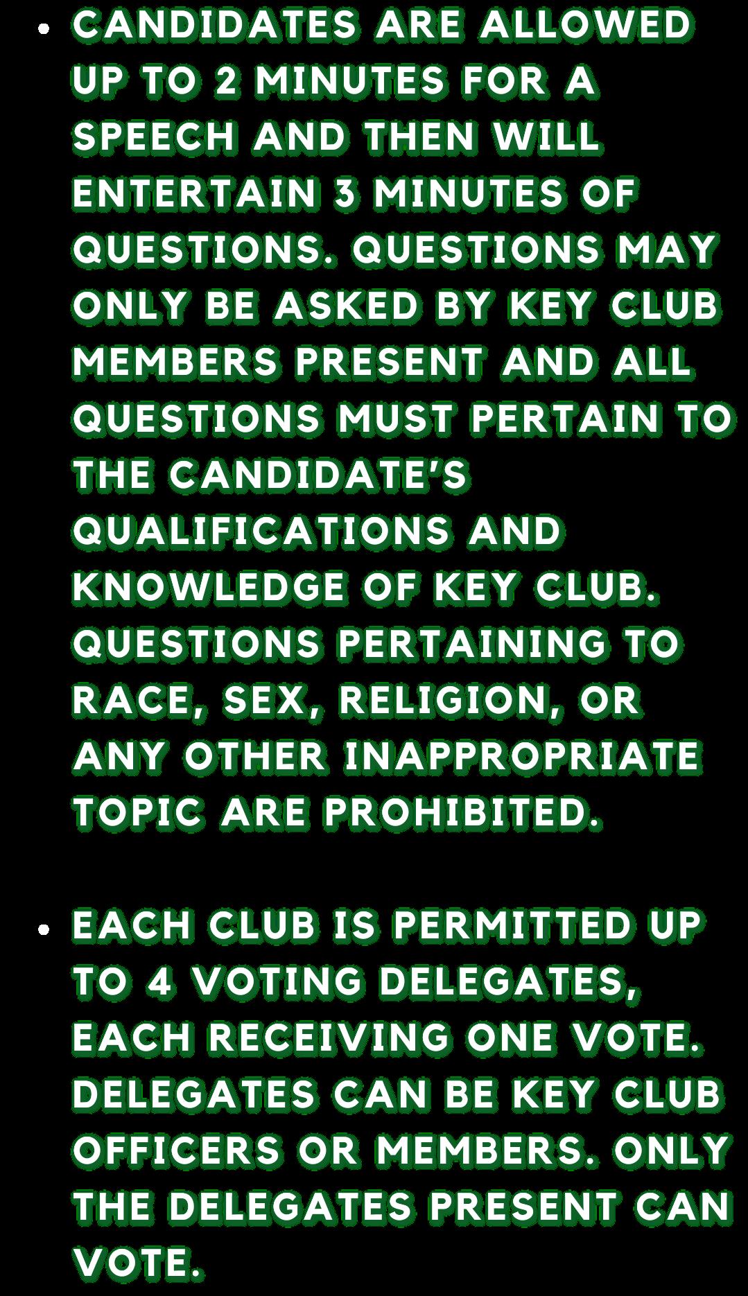 CANDIDATES ARE PROHIBITED FROM CAMPAIGNING BEFORE OR AT THE DEC. INFRACTIONS OF THIS RULE WILL RESULT IN DISQUALIFICATION. EACH CLUB IS LIMITED TO ONE ENDORSEMENT OF A CANDIDATE (MEANING THE CLUB PRESIDENT AND ADVISOR HAVE SIGNED THE CANDIDACY FORM). OTHER CANDIDATES MUST BE NOMINATED OFF THE FLOOR. THE NOMINATION FROM THE FLOOR MUST BE MOVED AND SECONDED BY ATTENDING DELEGATES. NO VOTE IS NEEDED TO APPROVE A NOMINATION FOR CANDIDACY.