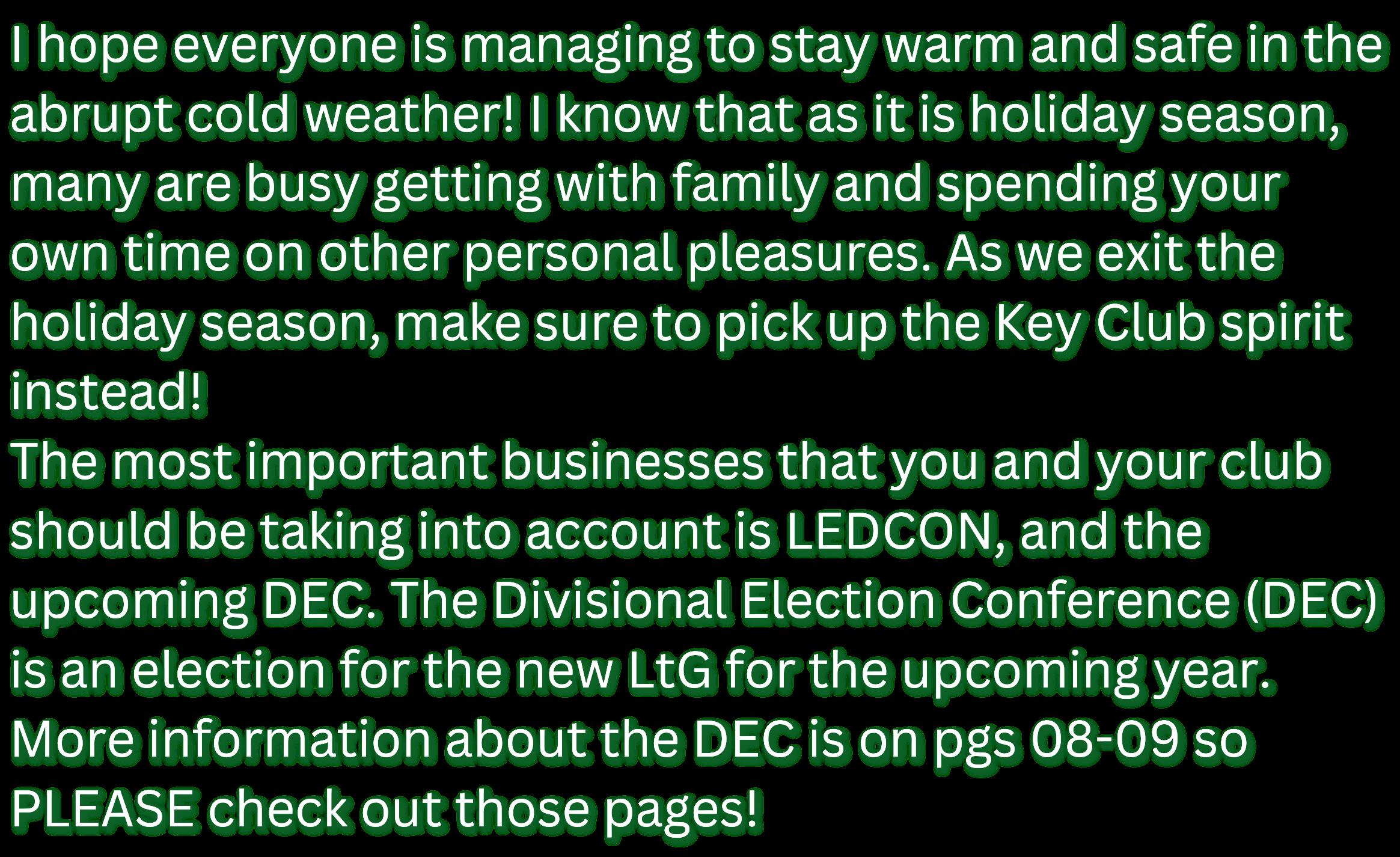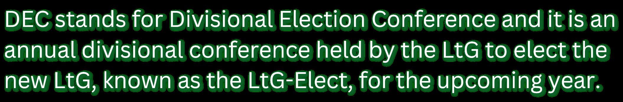 The Divisional Election Conference is where the new LtG will be elected for the next term! It will be on January 2ND @ 2:00 PM! More info on pg.