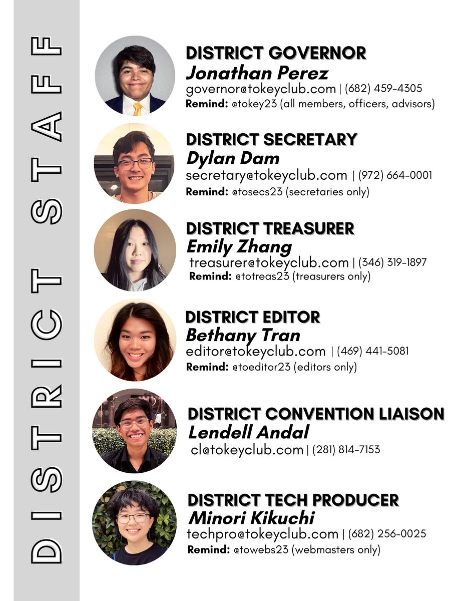 6 ADVISOR RAFAEL SANTOS E M A I L : R E G I O N 6 @ T O K E Y C L U B . C O M c o n t a c t m e a n y t i m e f o r a n y o t h e r c o n t a c t i n f o o r h e l p c o n t a c t i n g s o m e o n e ! DISTRICT ADMINISTRATOR ADRIAN THOMPSON E M A I L : A D M I N I S T R A T O R @ T O K E Y C L U B . C O M ASSISTANT ADMINISTRATOR BLAKE ROLLER E M A I L : A A E V E N T S @ T O K E Y C L U B . C O M find more info: websites keyclub.org tokeyclub.com @tokeyclub @keyclubint @tokeydivision18n DIVISION 18N LTG VIVIAN LEE E M A I L : L T G 1 8 N @ T O K E Y C L U B . C O M V I V I A N L E E . K C I @ G M A I L . C O M P H O N E : ( 5 8 0 ) - 5 7 4 - 2 8 2 9 27