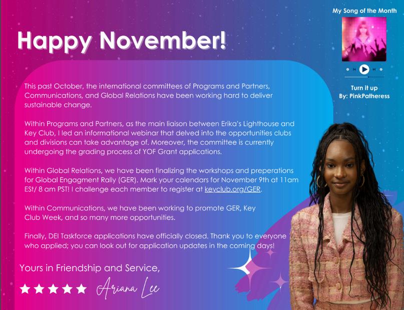 Key Club International GER will be held at 11 AM ET Saturday, November 9 on Zoom. Register for Global Engagement Rally TODAY!