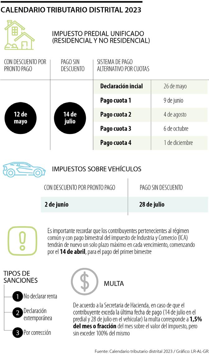 Son 11 los sectores que se y que La administración distrital de Bogotá dio a conocer el calendario tributario de 2023, según el cual los contribuyentes tienen plazo para declarar y pagar el impuesto predial sin descuento ni sanción hasta el 14 de julio. El descuento para el predial aplicó hasta el pasado 12 de mayo con un monto de 10%.