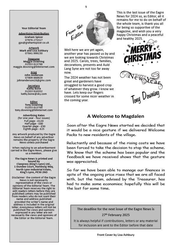 Welcome to the Winter Edition of the Eagre News! Packed with seasonal updates, local stories, and community highlights, this edition brings you closer to everything happening in and around our village. From nature's wonders to community efforts, there’s something for everyone to enjoy. Whether you're curious about the wildlife in our hedgerows or the latest village happenings, this issue will keep you informed and entertained throughout the colder months. Dive in and stay connected to our vibrant village life this winter!