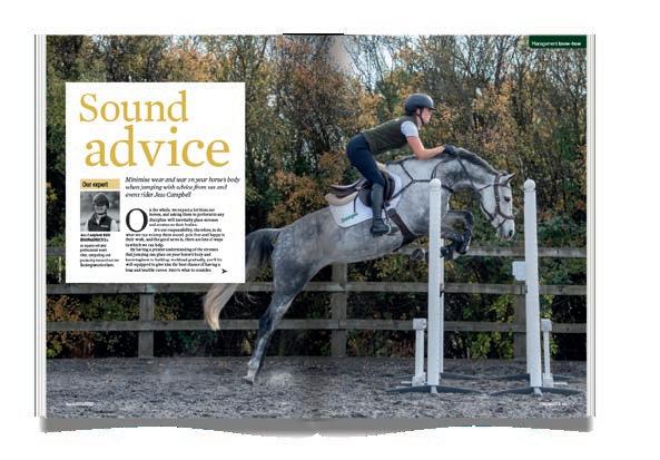 routines to help reduce the risk of injury and disease. Our experts share their simple, practical ideas on p62 and 114. Whatever you enjoy doing with your horse, it’s worth exploring the last part of Nina Gill’s polework maze on page 30. While the floorplan takes a little setting up, the rewards are well worth it. Until next month!