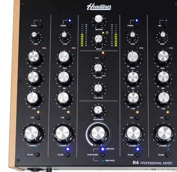 Headliner, a Mixware brand, has introduced the Headliner R4, a 4-channel analog rotary mixer. The unit is crafted with genuine ALPS potentiometers, ensuring precise control over every nuance of sound. The mixer features four Line inputs, three phono inputs, and one mic input spread across four stereo channels. Each channel is equipped with essential features such as gain control with peak LED, a 3-band isolator EQ, headphone cue selector, generous channel volume knob, and a filter activation switch, providing DJs with the tools they need for seamless mixing. Its Master channel is equipped with an analog filter, headphone monitoring, and a comprehensive output control section. Seamlessly toggle between High Pass/Low Pass Filter modes with Frequency and Resonance controls to shape your signature sound. Headliner/Mixware 11070 Fleetwood St., Unit F Sun Valley, CA 91352 (818) 578-4030 www.mixware.net