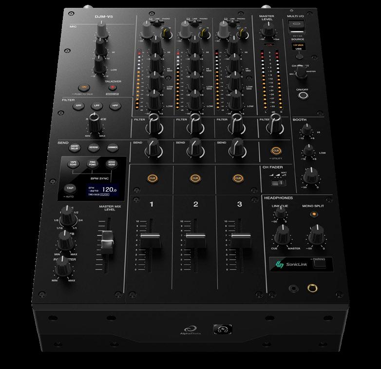 AlphaTheta has introduced the DJM-V5, compact, 3-channel mixer. The unit draws on the design philosophy of the DJM-V10, a 6-channel mixer, and condenses it into a more compact unit. While it’s physically smaller, it offers potential for creative mixing, even in DJ booths with limited space. DJs can use a more advanced range of effects, including upgraded flters and Send FX –no matter what the setting. The built-in SonicLink transmitter, which uses AlphaTheta’s unique ultra-low-latency wireless technology, enables DJs to perform with greater freedom. Pair it with HDJ-F10 headphones, and DJs can monitor music wirelessly with minimal latency. With its streamlined layout, rekordbox and Serato DJ Pro compatibility, and refned feature set, the DJM-V5 brings precise sound control and creative performance capabilities.